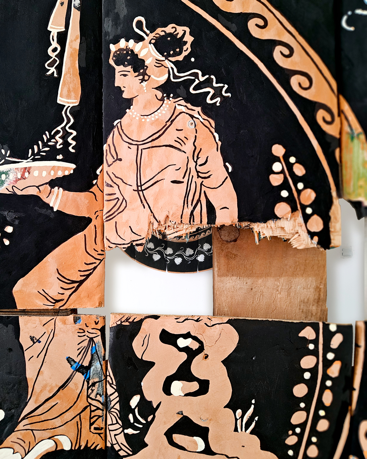 The vine scrolls and vegetal motifs invade the composition. They are not ornamental. They signal a continuity between nature, bodies, and ritual, reminding us that celebration is a force that traverses epochs as much as it belongs to a given culture. The work is composed of fragmented skateboard decks, subsequently covered with clay. This contemporary material, marked by use, impact, and repetition, is deliberately treated as a vestige. It does not quote Antiquity; it adopts its temporal regime.