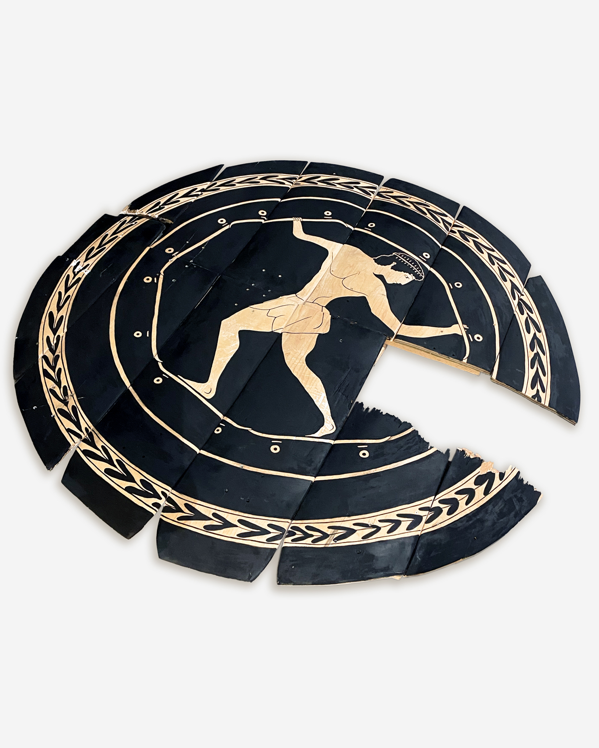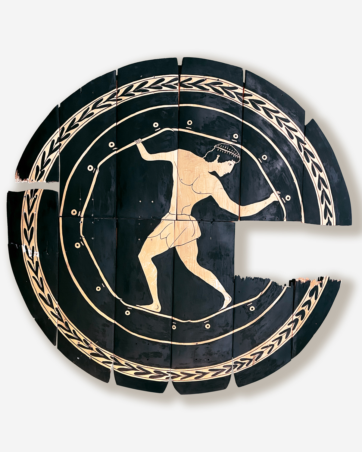 This work is a continuation of Rom av.JC’s work, in which skate culture interacts with the visual codes of Antiquity. Inspired by the circle board created by Mark Gonzales — nine boards fixed end to end to form a perfect circle — it imagines this radical gesture as a forgotten sporting ritual, a fragment of which was found in Chalon-sur-Saône or Beaune.