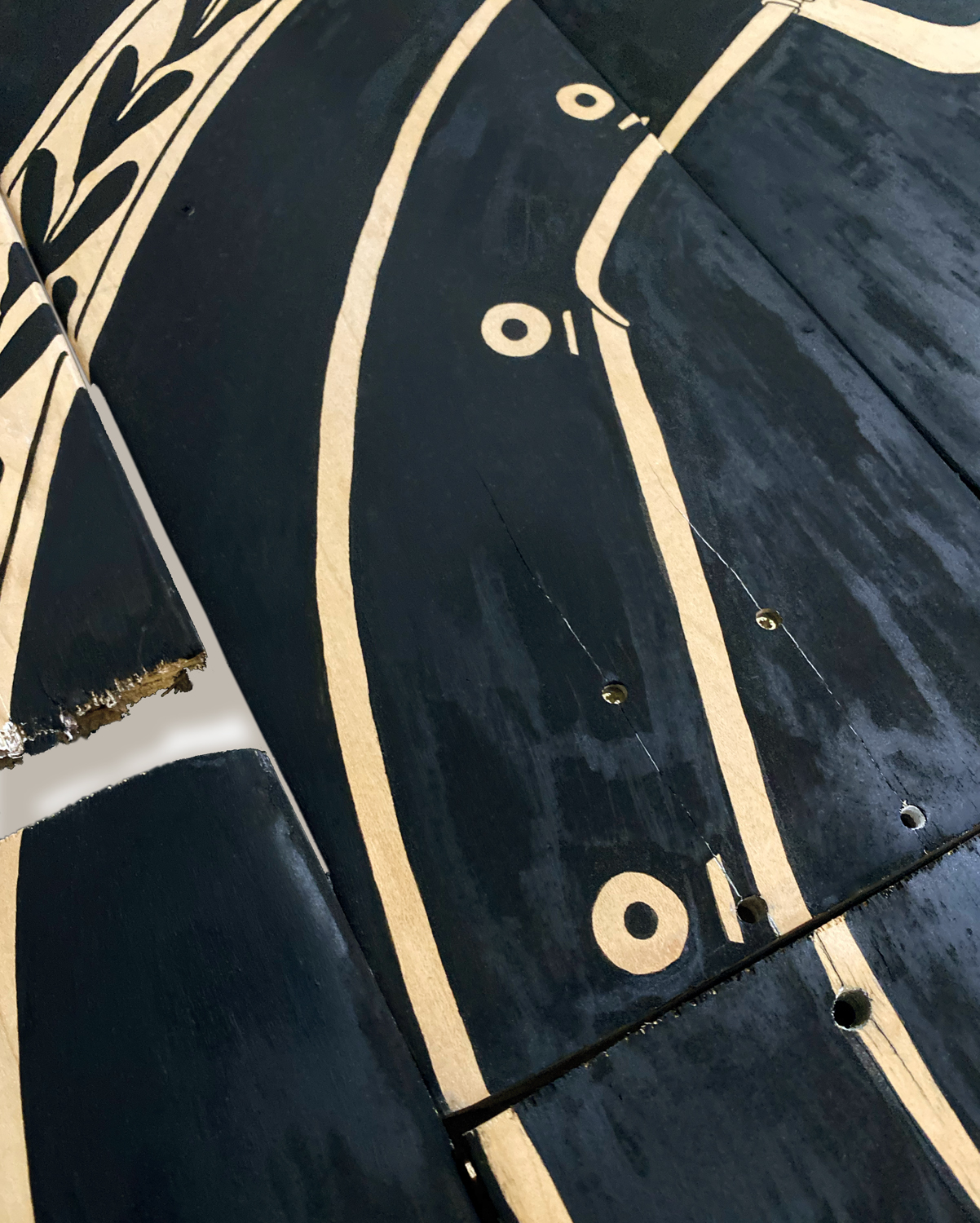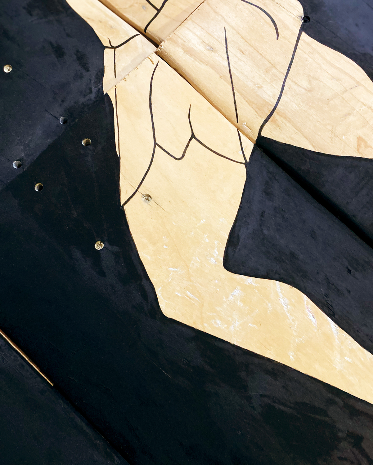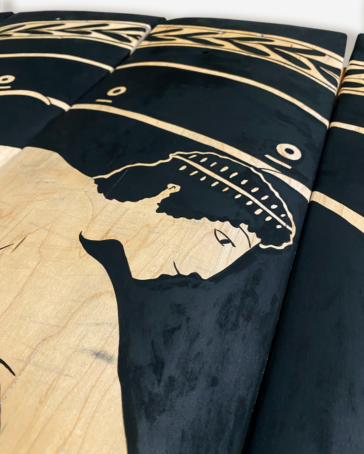 Made from broken skateboards, assembled and then engraved, the work deliberately blurs the boundaries between relic and contemporary creation. It questions what sports, their icons, and their inventions convey to us: stories, gestures, new forms of devotion.