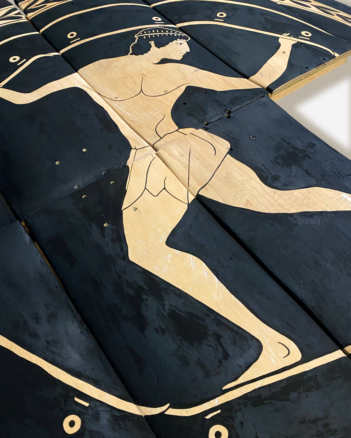 The central figure, a mythological athlete or archaic skateboarder, moves in an infinite loop. His movements, stylized as if on Attic pottery, evoke the physical tension, momentum, and controlled imbalance that make modern skateboarding so beautiful.